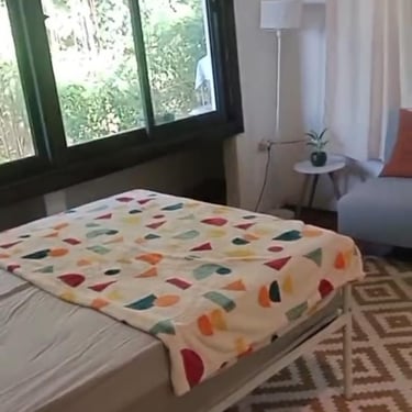 The residency offers three types of accommodation to suit different needs and project setups. The main studio now contains two semi-private Studio Rooms, separated by walls with curtains for privacy. Each room includes a bed, small wardrobe, and lamp.